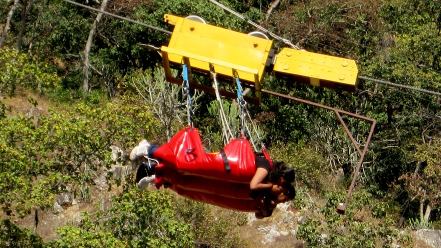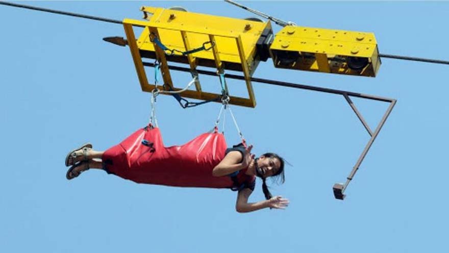 You are harnessed to the wire and on release by gravity roll down the wire upto 7 mtrs above the river level and then going up. Finally returning & settling down at the lowest point. Accelerate upto speeds of 160 kmph. Feel the air gushing past. You are pulled back to the launch platform by a retrieval mechanism. Walk back to the cafeteria and enjoy watching your photographs & video of the jump. Normally done by 3 people in Tandem. Can be done alone at an extra cost. Don’t forget to collect your Dare to Jump Certificate.