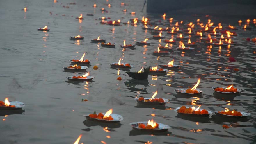 Walk along the sacred ghats lining the banks of the holy Ganges